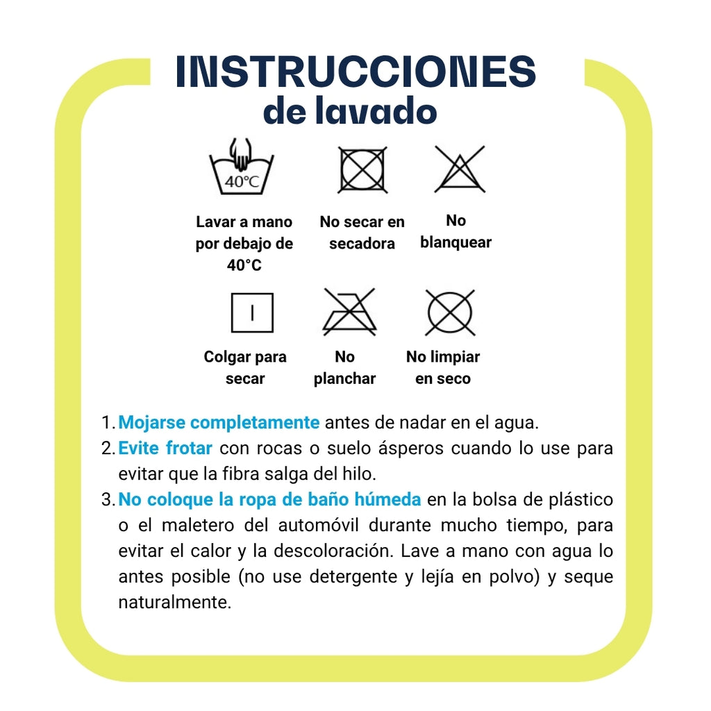 No coloque la ropa de baño húmeda en la bolsa de plástico o el equipaje de la caja trasera del coche durante mucho tiempo, para evitar el calor y la decoloración. Lave a mano con agua lo antes posible (no use detergente y lejía en polvo), seque naturalmente.